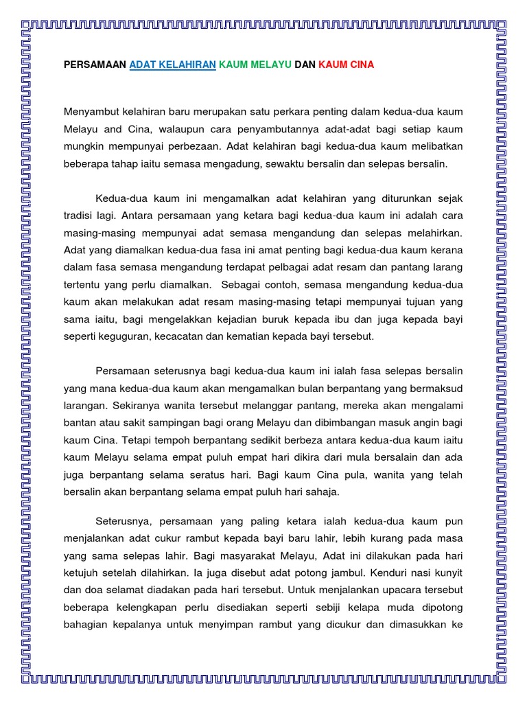 Terima kasih atas tontonan anda s3mua. Bercakap berkenaan adat didalam masyarakat melayu, ramai sarjana mengatakan bahawa adat melayu merupakan adat jawi iaitu adat yang bercampur. Tradisi kelahiran anak melayu (akikah). Boleh lah kita tgk mana yg boleh kita ikut. Bulan kelahiran ternyata membawa firasat tentang watak dan tabiat manusia di kehidupannya kelak. Adat kelahiran masyarakat melayu, cina dan india. Adat dalam kebudayaan melayu ini, telah ada sejak manusia melayu ada. Tradisi seelok ini sudah sepatutnya untuk dijaga dan dilestarikan. Bersedia dengan senarai barang bayi ke hospital. Selain dilihat dari tanggal lahir, weton dan ramalan yang lain. Sami atau sesiapa sahaja yang berpengetahuan tinggi mengenai agama hindu akan membisikkan gayatri. = sebaik sahaja bayi dilahirkan sami atau sesiapa sahaja yang berpengetahuan tinggi mengenai kenduri arwah ini sebenarnya adat resam melayu saja, bukanlah tuntutan dalam agama. Kaum melayu, buku kerja program integrasi keagamaan, program latihan khidmat negara malaysia;